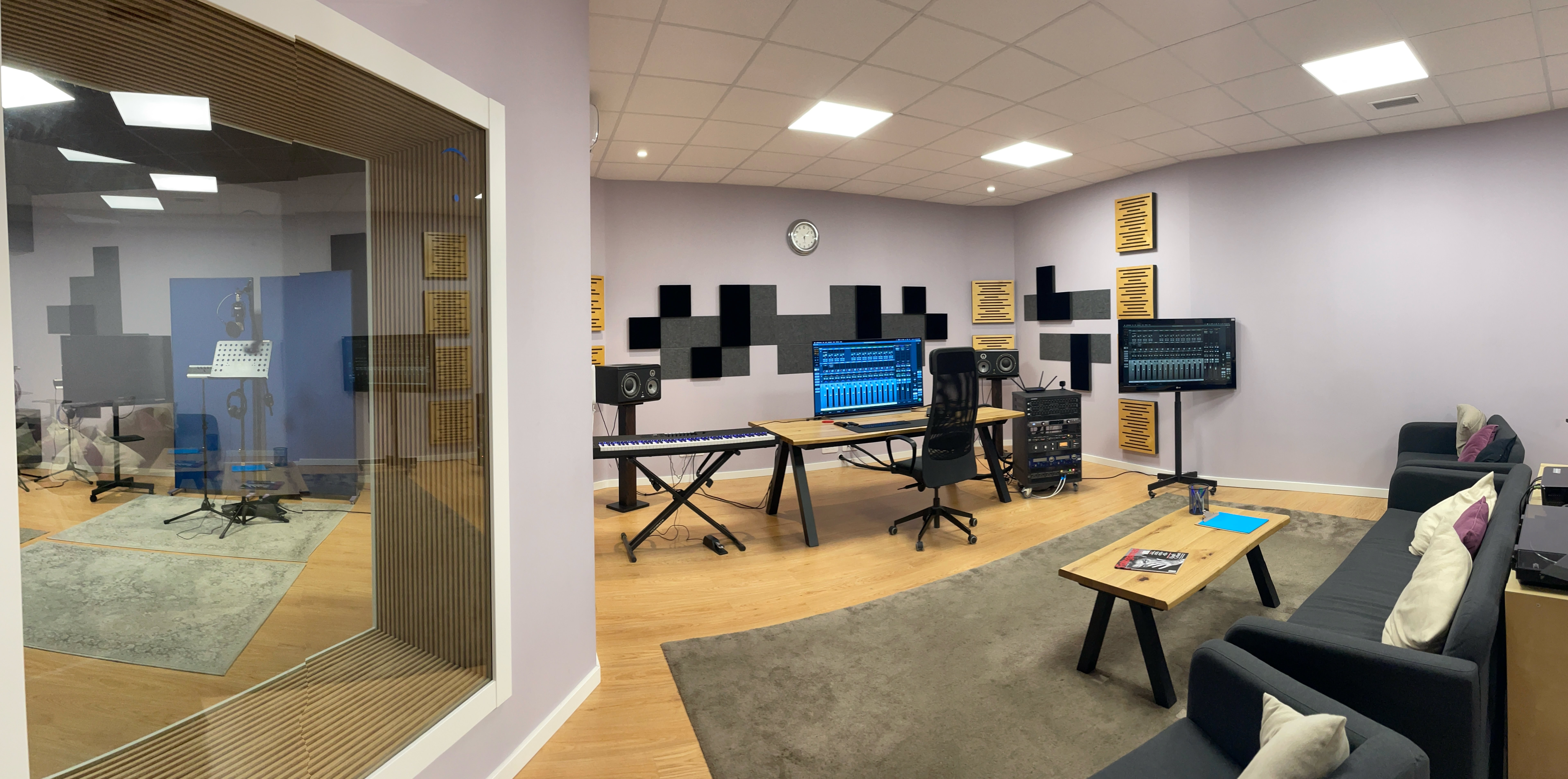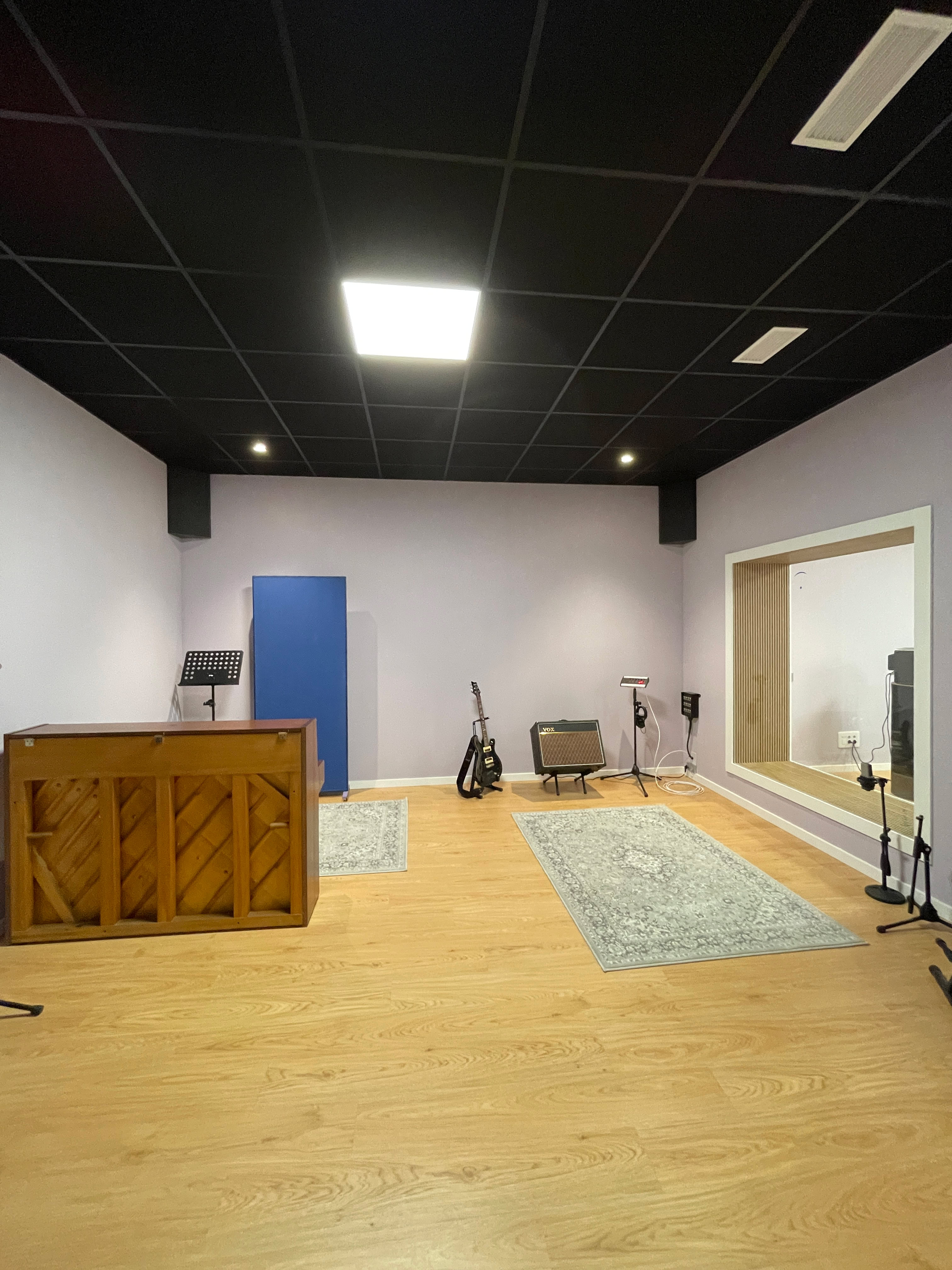 Nuestra Sala A cuenta con 25 m² diseñados para ofrecer una acústica cálida y equilibrada. Este espacio ha sido cuidadosamente insonorizado y acondicionado para garantizar resultados sonoros excepcionales, ya sea para grabaciones vocales, instrumentales o sesiones más complejas. Dispone de una doble comunicación visual directa con la zona de control principal de nuestra Sala M, facilitando una conexión perfecta entre el artista y el técnico.